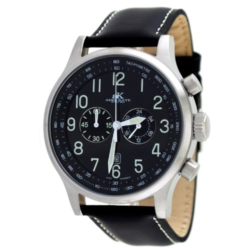 Adee Kaye Watch: Adee Kaye AK201-M BLACK men's watch features a highly brushed finish solid stainless steel case with screw down case back. This great watch also features high quality Japanese quartz movement, water resistant up to 50 meters, anti reflective & scratch resistant mineral crystal, black leather strap and an oversized black dial with chronographs and date display functions..../ Adee Kaye AK201-M BLACK Men's Oversized Chronographs Black Leather Strap Watch / Mens Oversized Watches